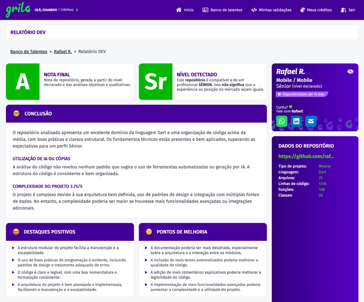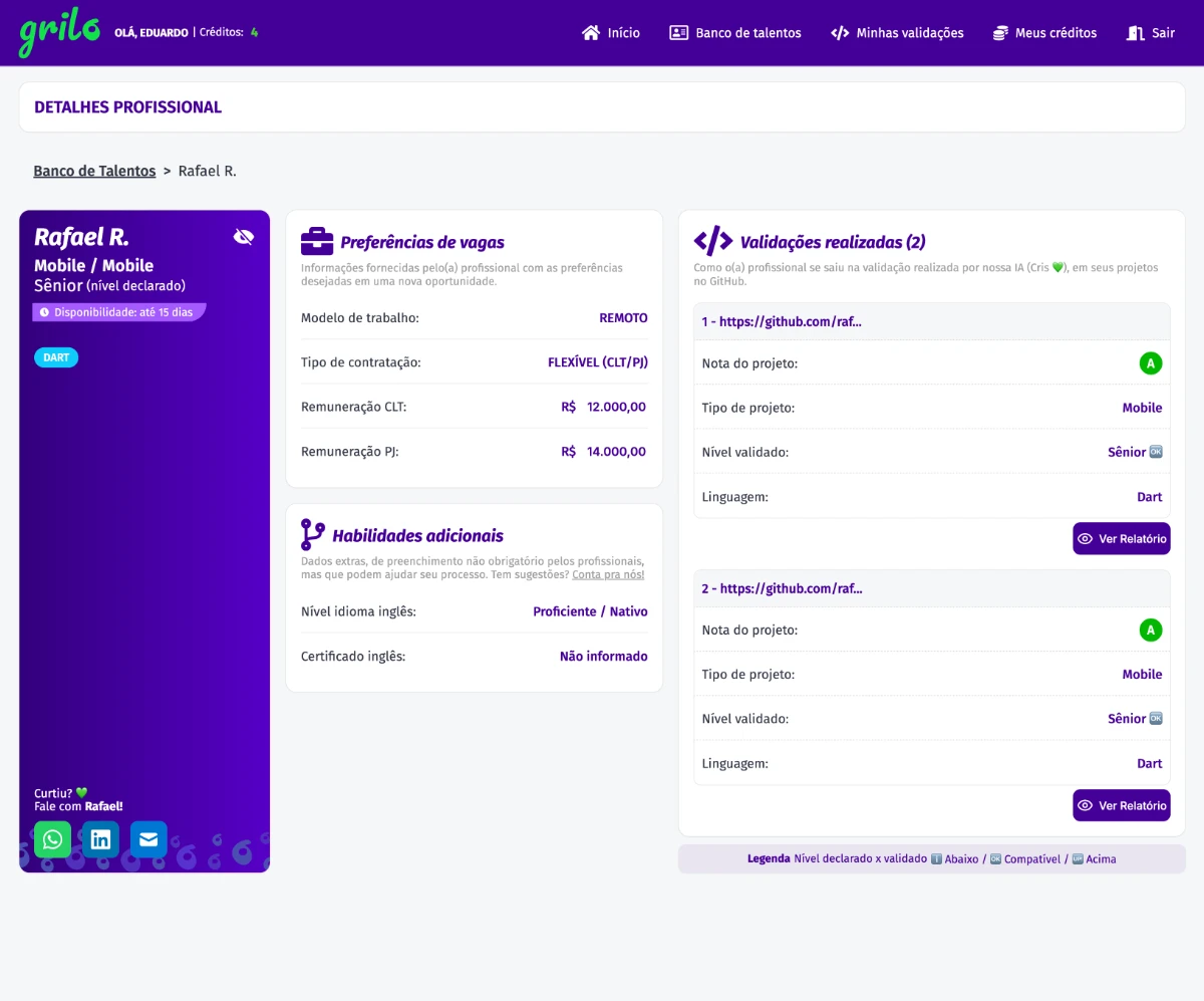 Ao utilizar seus créditos para visualizar os dados de contato de um profissional, você terá acesso ao nome, e-mail, WhatsApp, perfil do LinkedIn e URL do repositório avaliado pela Cris.